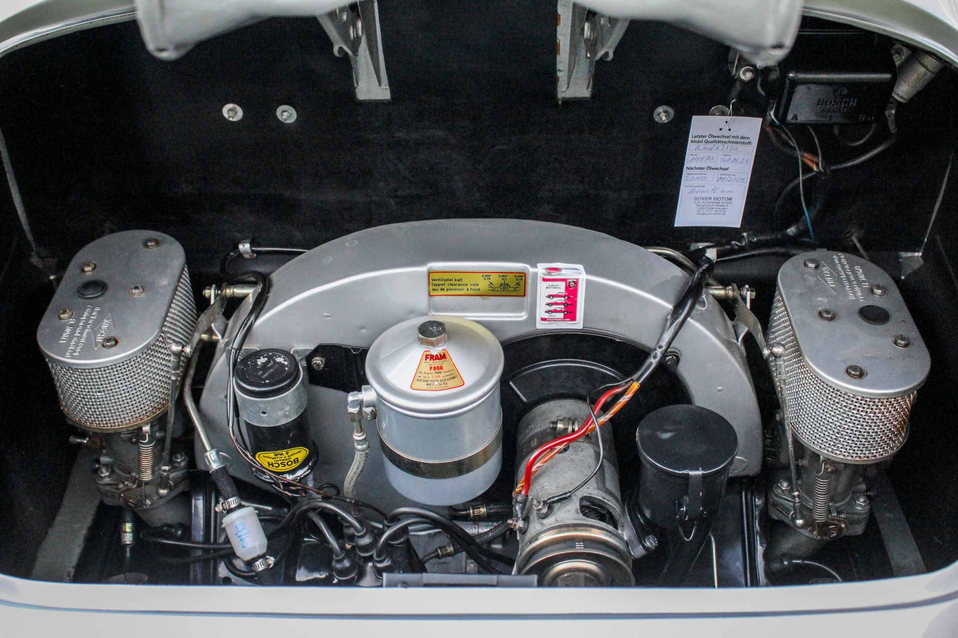 Über einen Dänischen Oldtimerhändler kam der Porsche 2014 nach Deutschland zu seinem aktuellen Besitzer. Dieser entschied sich dazu, das komplette Fahrzeug bei einem namhaften Porsche Spezialisten technisch überprüfen zulassen und alle notwenigen Servicearbeiten durchzuführen. Insgesamt investierte der Eigentümer knapp 6.000,- € in das Fahrzeug, wobei der perfekte Fahrzeuglack und die gesamte Optik nicht angetastet wurden. Da der Eigentümer das Fahrzeug stets perfekt haben wollte, wurde 2017 im Porsche Zentrum in Reutlingen eine komplette Motorrevision durchgeführt. Dabei wurden schließlich 18.000,- € bezahlt, wovon selbstverständlich ebenso wie von allen Wartungsarbeiten in den Jahren zuvor, alle Rechnungen vorhanden sind. Ein Jahr später wurde der Bremszylinder inkl. der gesamten Bremsanlage Instand gesetzt, so dass diese originale Trommelbremsanlage perfekt funktioniert. Dies schlug sich mit 1.200,- € zu Buche. Somit wurde in die Technik des seltenen Porsche 356 BT5 Super 90 in den letzten Jahren insgesamt über 25.000,- € investiert, wodurch sich das Fahrzeug im perfekten Zustand befindet. Im Juni 2024 wurde bei ein weiterer Service durchgeführt, so dass das Fahrzeug sofort einsatzbereit ist.